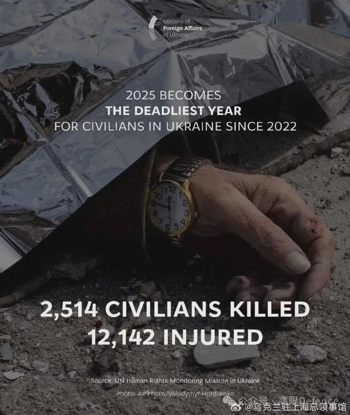 根据联合国人权监察机构的数据,2025年成为自2022年以来乌克兰平民伤亡最惨重的一年。俄罗斯至少造成2514名平民死亡,超过12000人受伤,这一数字远高于2023年和2024年。